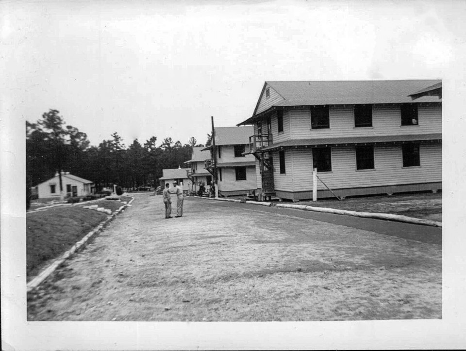 02-Fort Jackson Barracks ← Previous Next → “A picture of most of our company street. The Orderly Room is on the left. The buildings on the right are barracks.”